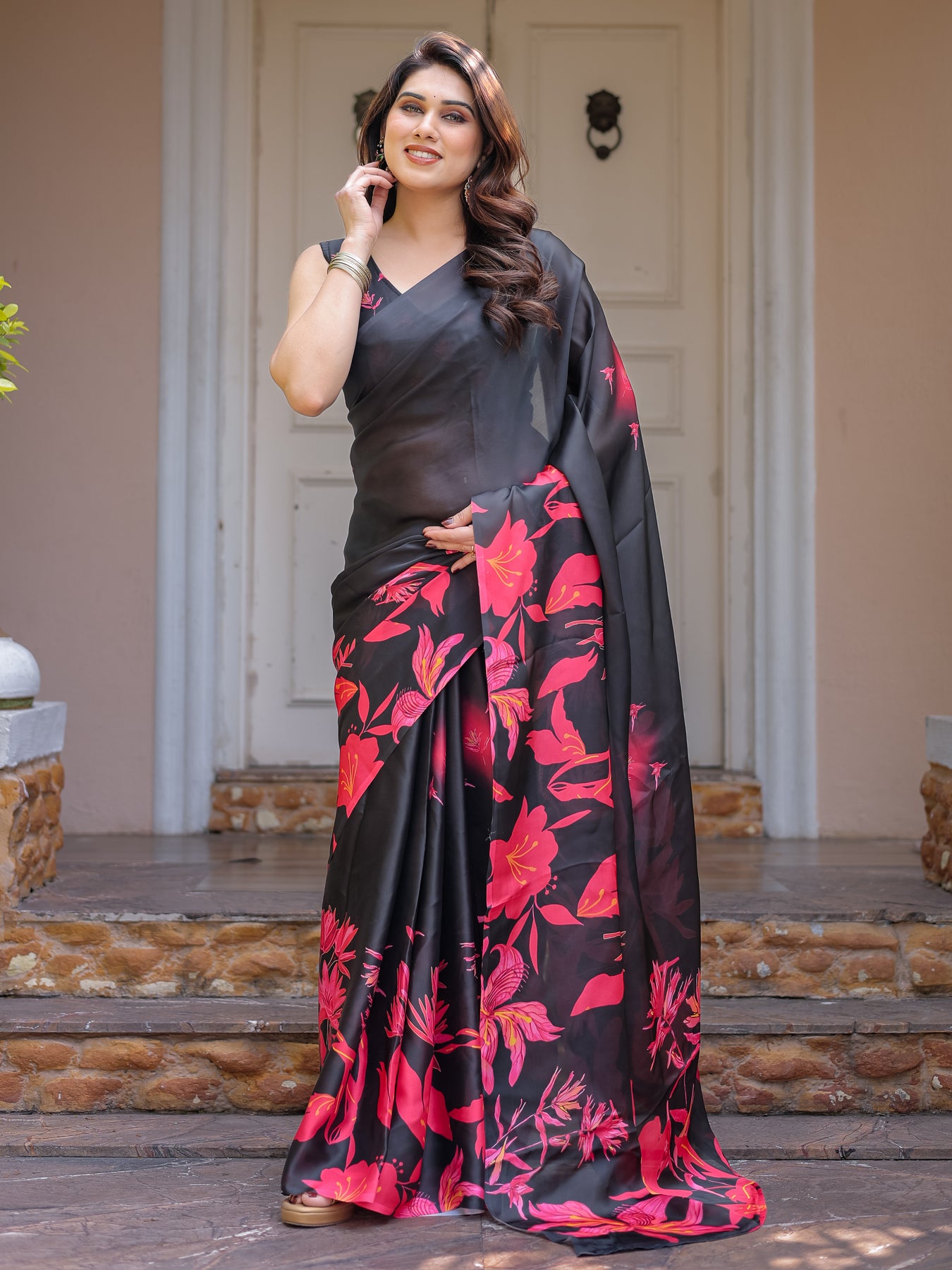 Black & Hot Pink Floral Printed Satin Georgette Saree with Matching Blouse – Statement Party & Evening Wear