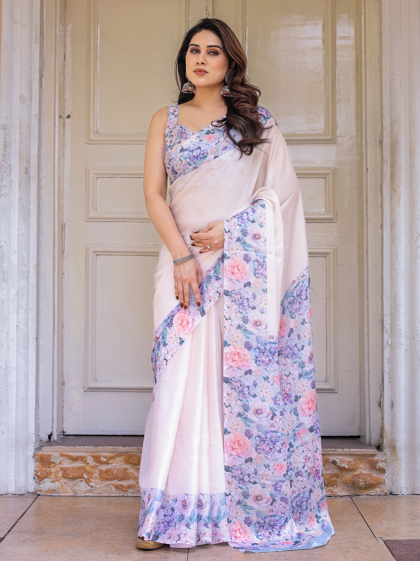 Celebrate delicate femininity with this blush pink satin georgette printed saree, designed for women who love graceful charm and romantic pastel aesthetics. The soothing pastel pink base is beautifully adorned with dense floral artwork in shades of lavender, rose pink and soft blue, creating a dreamy and elegant appeal perfect for day celebrations and sophisticated evenings.