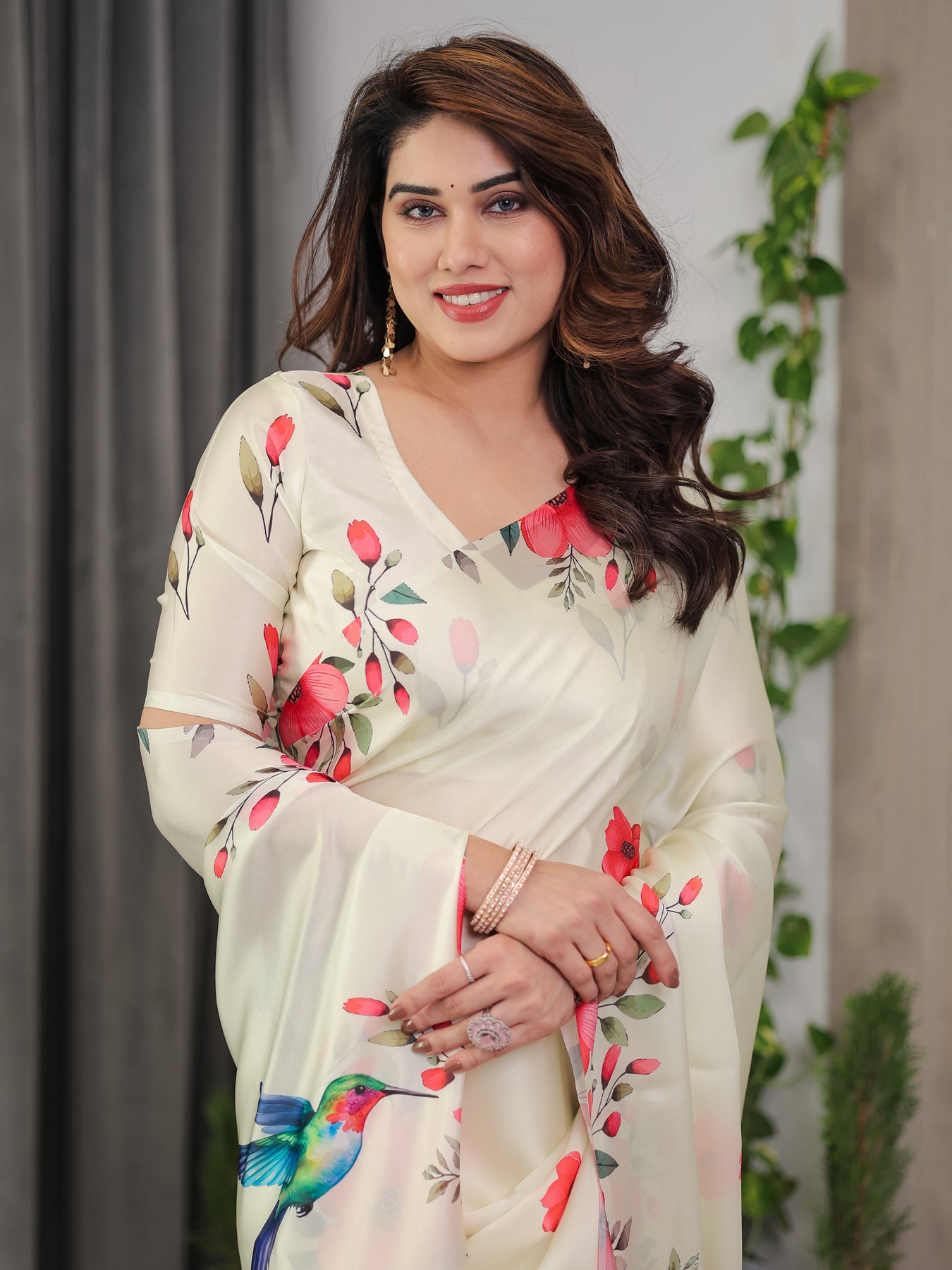 Bring home timeless elegance with this Ivory Cream Satin Georgette Printed Saree from Almaari Fashion, designed to celebrate nature through delicate florals and graceful bird motifs. Crafted in premium satin georgette fabric, this saree offers a soft sheen, feather-light feel, and a fluid drape that flatters effortlessly.