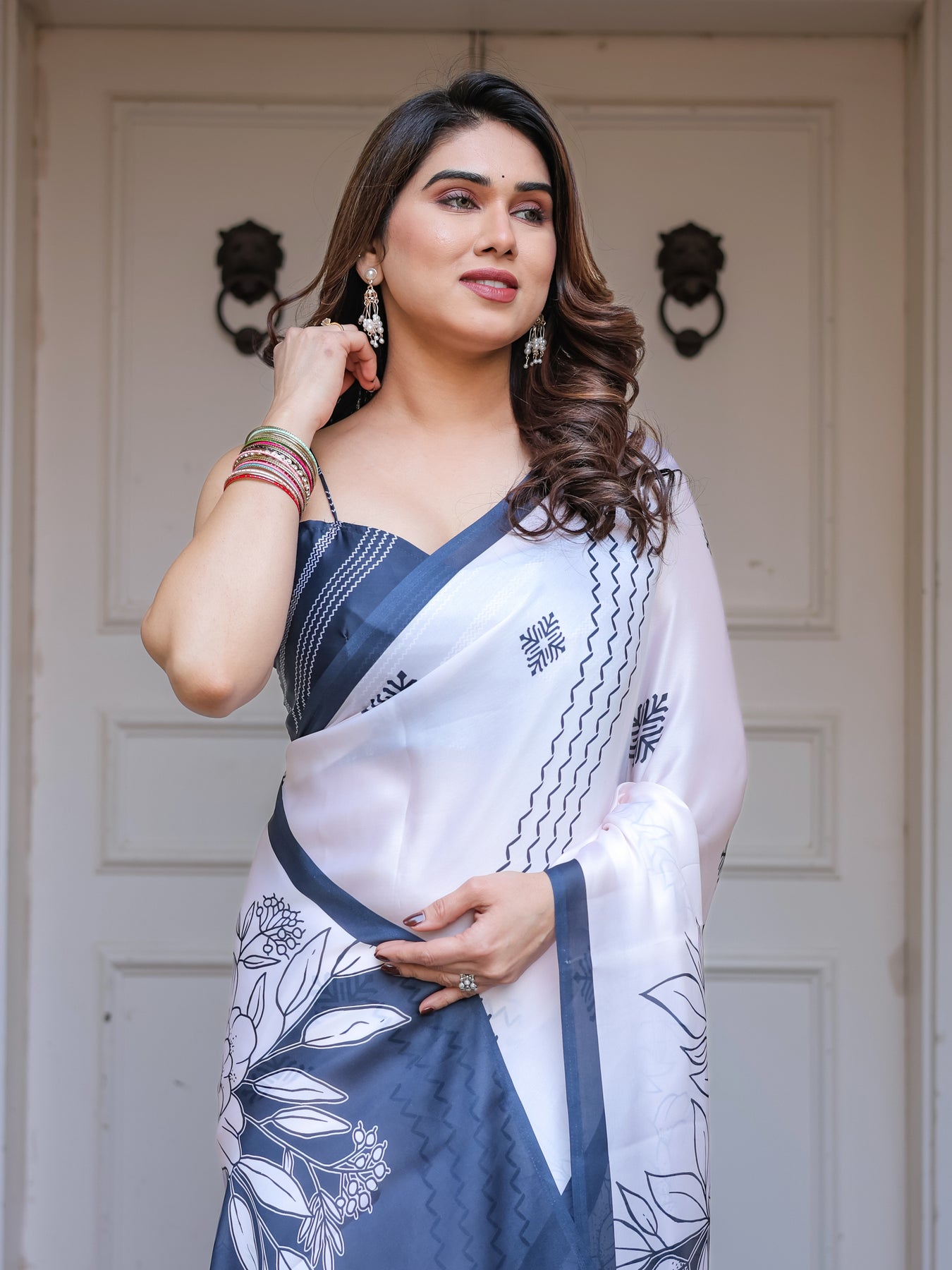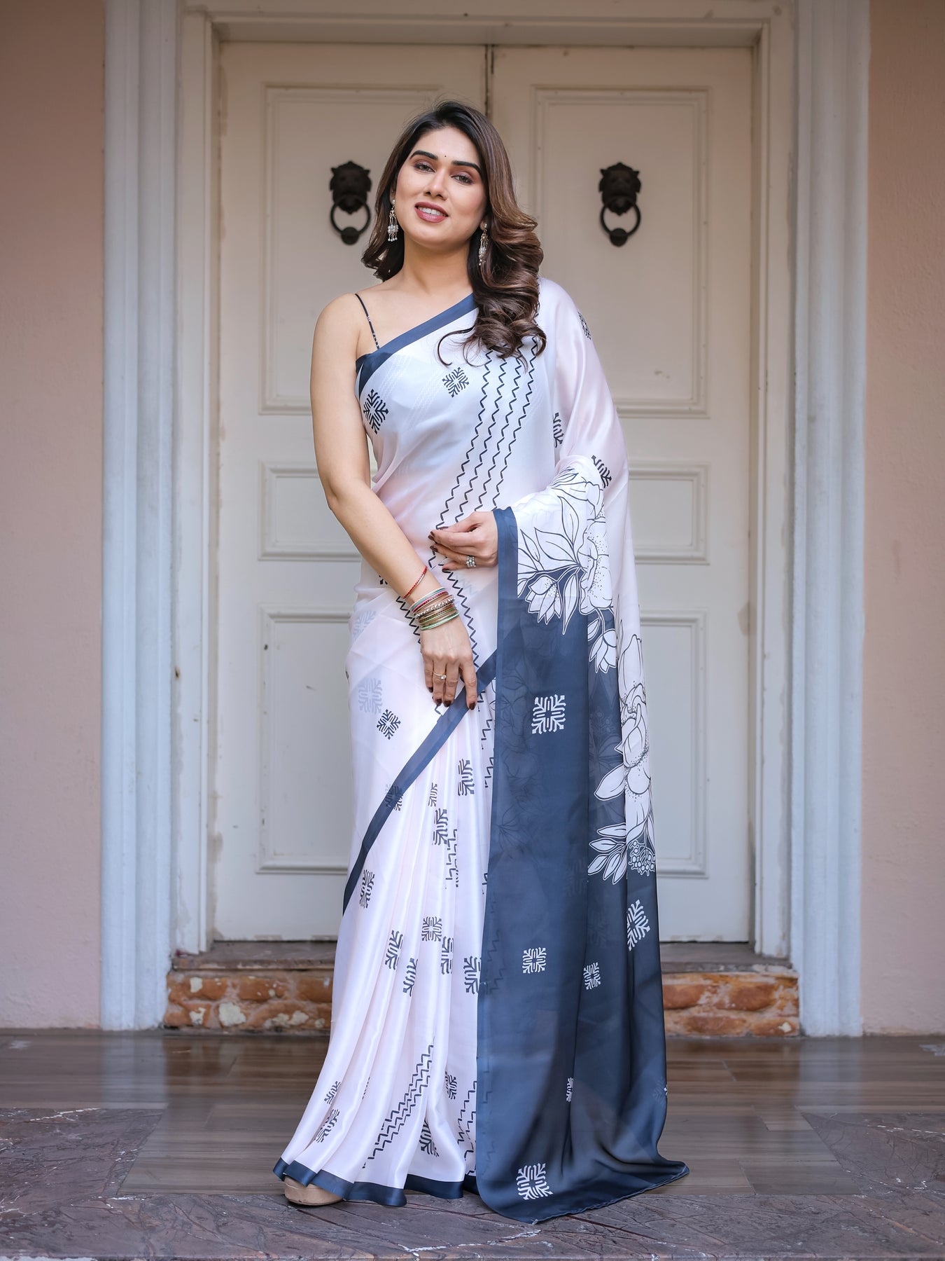 Made from premium satin georgette fabric, it offers a smooth silky feel, lightweight comfort, and a beautifully fluid drape that enhances your silhouette. The monochrome palette makes it a versatile choice suitable for both formal and festive occasions.