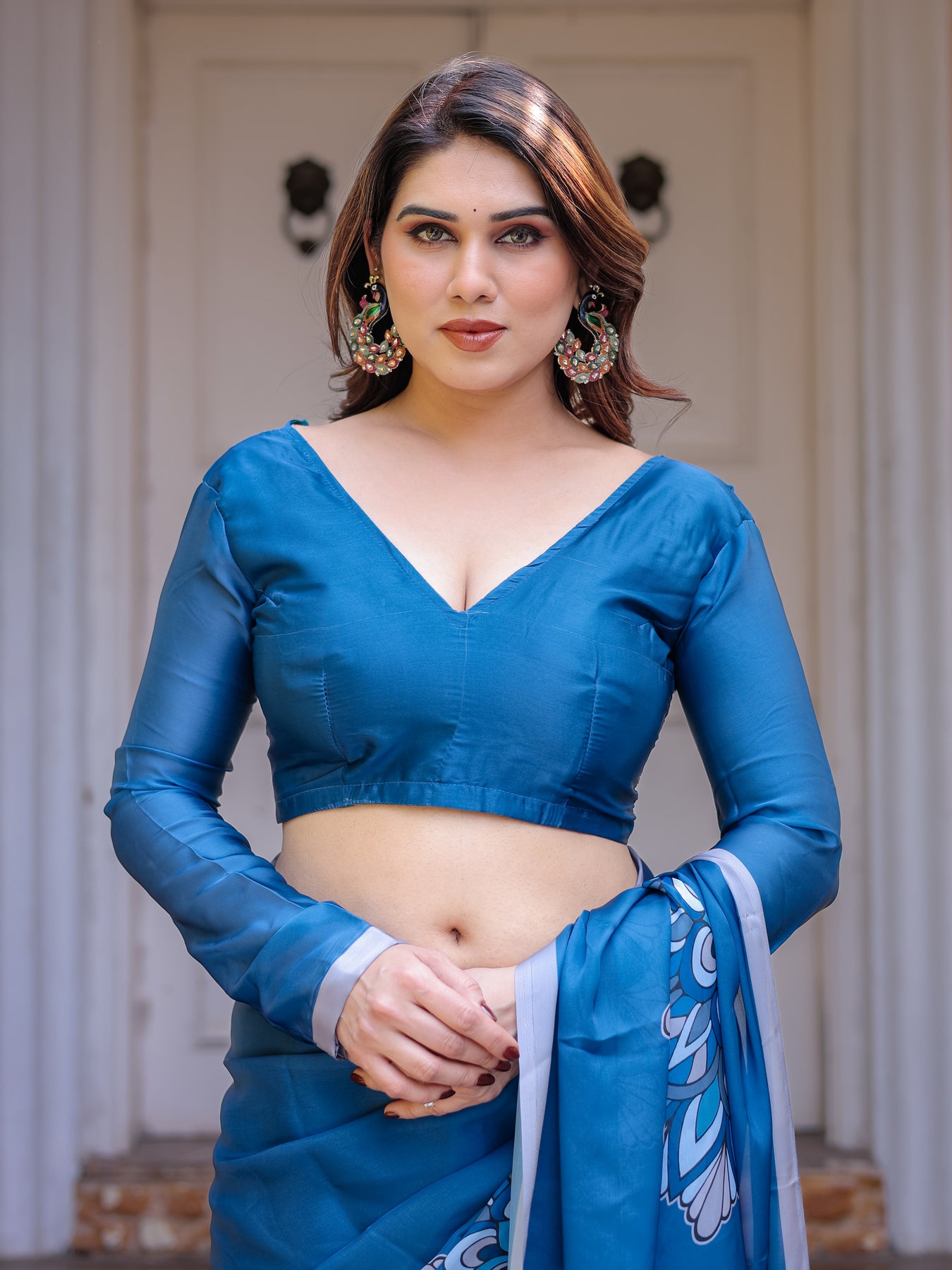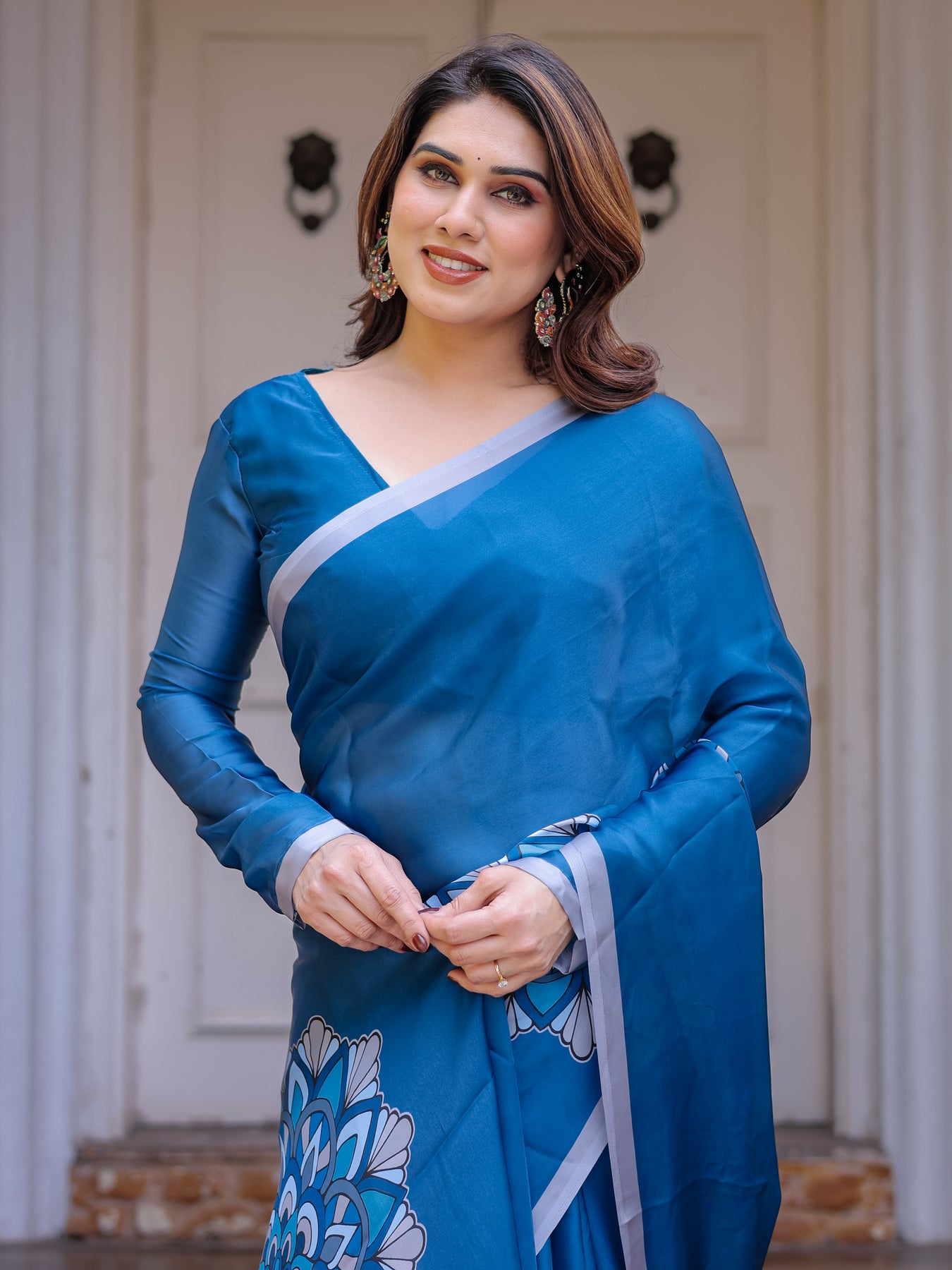 Teal Blue Mandala Printed Satin Georgette Saree with Matching Blouse – Contemporary Party & Festive Wear