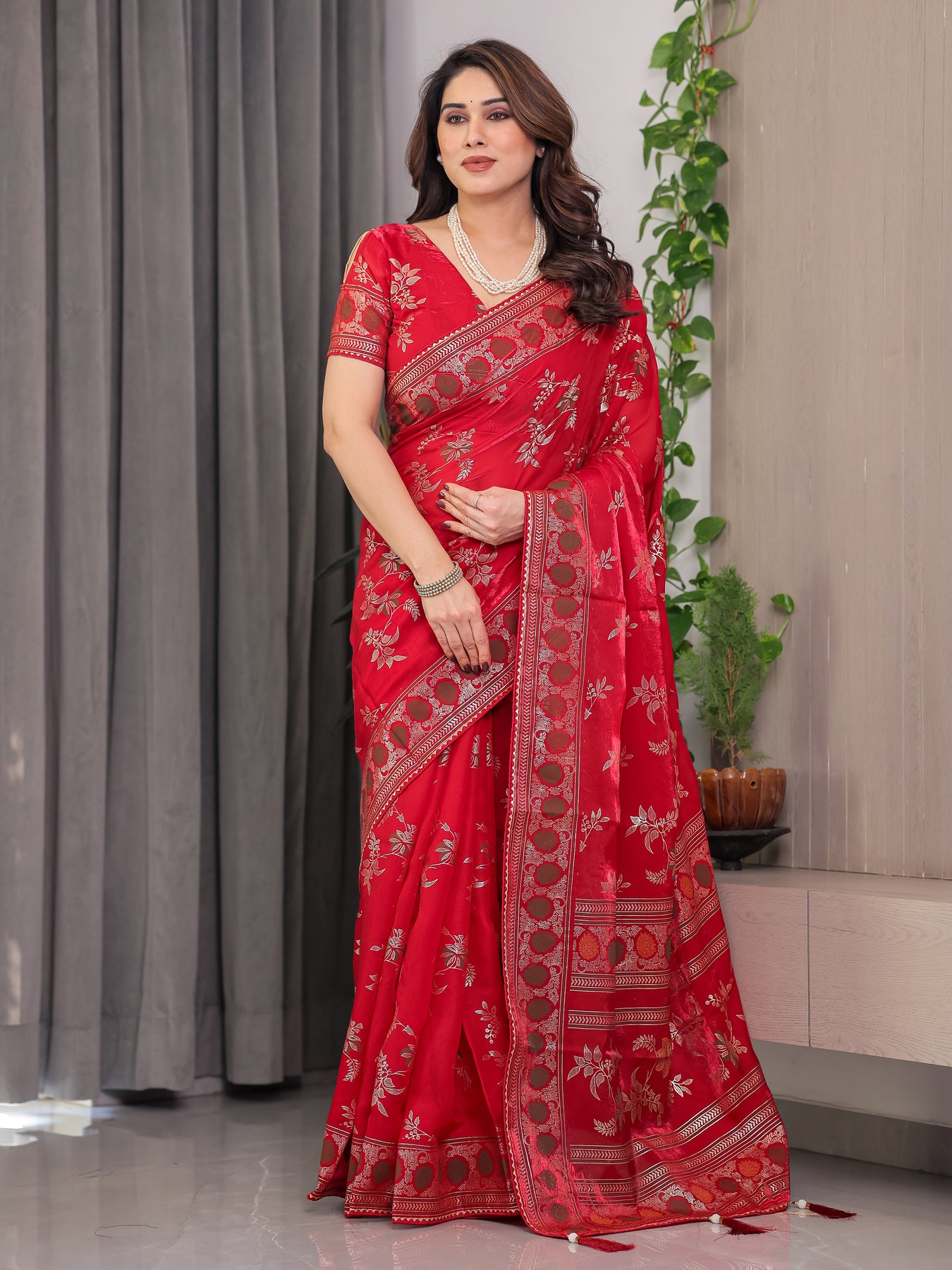 Pair this red saree with kundan or pearl jewellery for a regal festive look. Style your hair in soft curls or a low bun, and opt for golden heels or embroidered juttis. Keep the makeup elegant with kohl-defined eyes, warm blush tones, and a bold red or deep nude lipstick to enhance the richness of the saree.