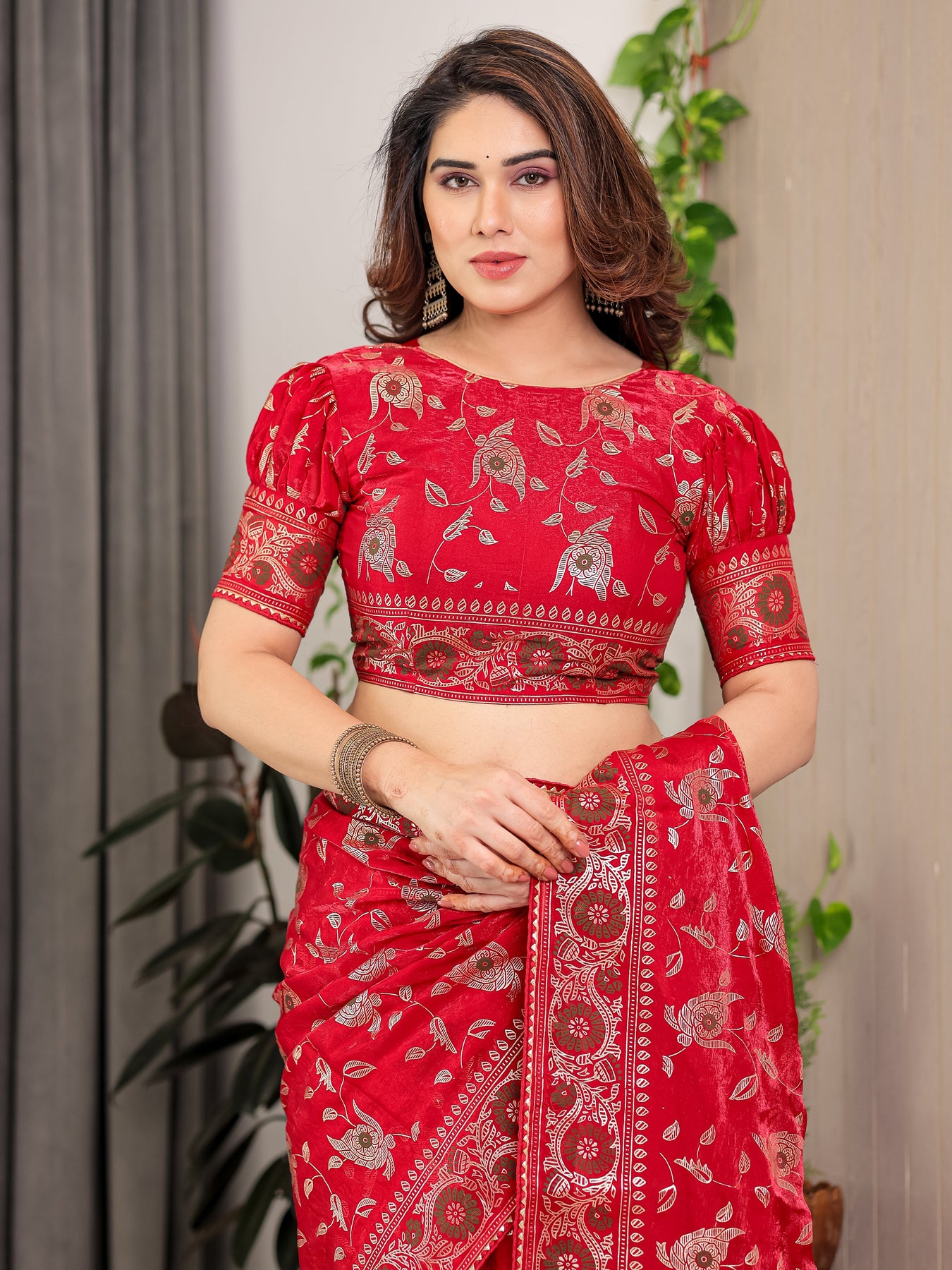 Make an unforgettable ethnic statement with this Crimson Red Fendi Satin Floral Block & Foil Print Saree, crafted for women who love rich colors, intricate detailing, and timeless elegance. Made from luxurious Fendi satin fabric, this saree features a soft, glossy texture and a smooth, graceful drape that enhances your silhouette effortlessly.