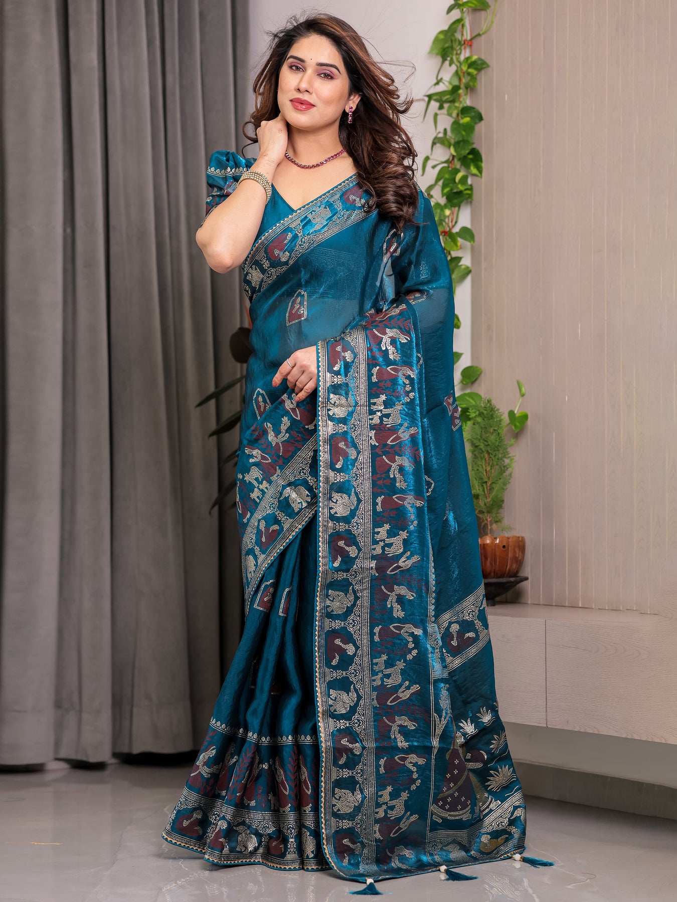 Peacock Teal Blue Fendi Satin Peacock & Floral Block and Foil Printed Saree with Traditional Border, Tassel Edges & Attached Blouse