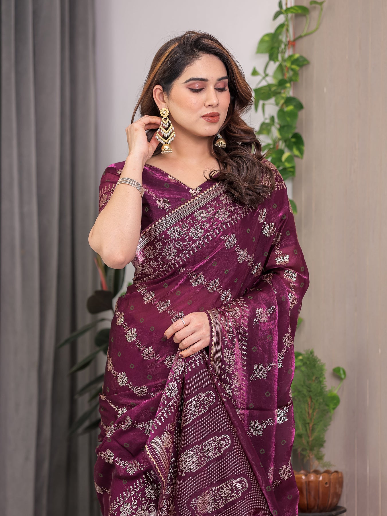 Plum Wine Fendi Satin Block & Foil Print Saree with Floral Motifs, Attached Blouse & Tassel Detailing