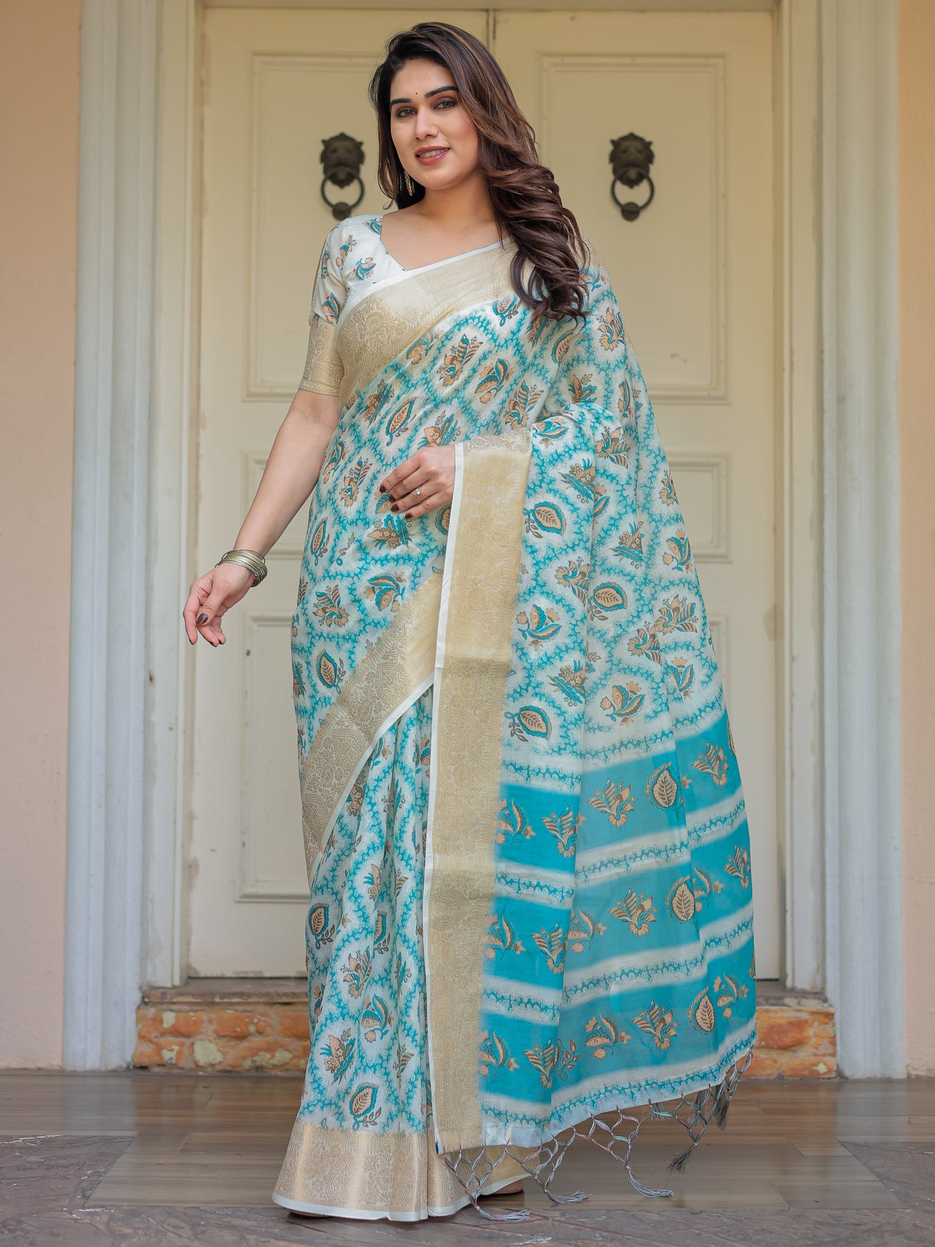 Saree Color: Ivory & Turquoise Blue