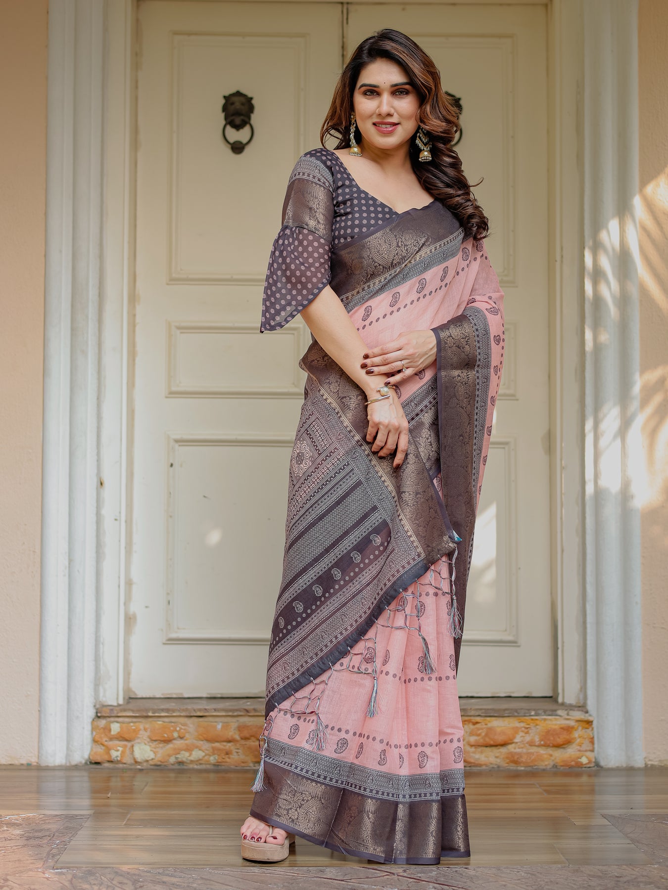 Blush Pink & Charcoal Grey Traditional Woven Saree with Antique Zari Border & Tassels – Elegant Festive Ethnic Wear