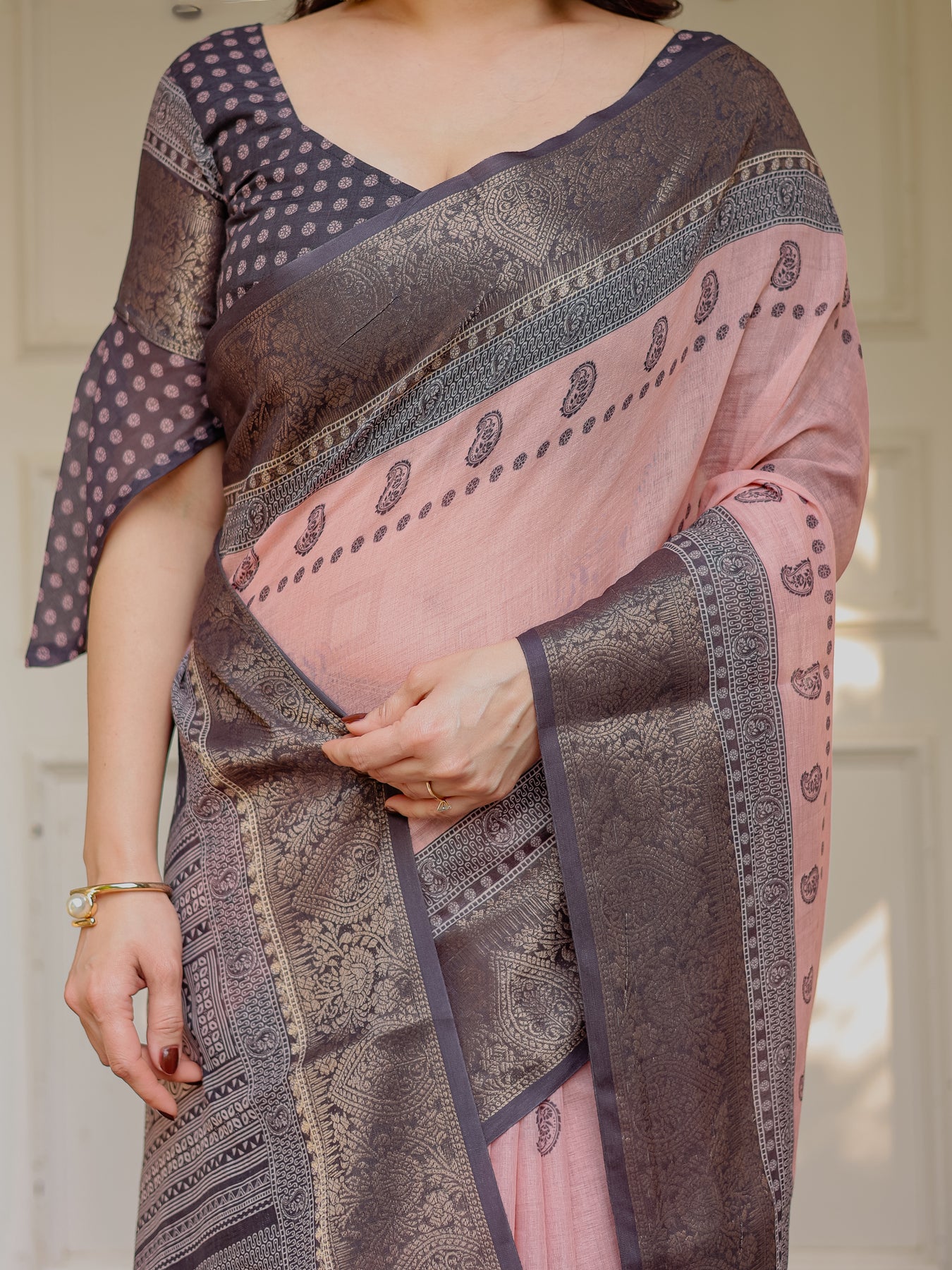 Grace meets sophistication in this beautifully balanced Blush Pink & Charcoal Grey traditional woven saree, crafted for women who prefer subtle elegance over loud shine. The soft blush pink body creates a calm feminine base, perfectly contrasted by the deep charcoal grey pallu and border that bring richness and heritage character.