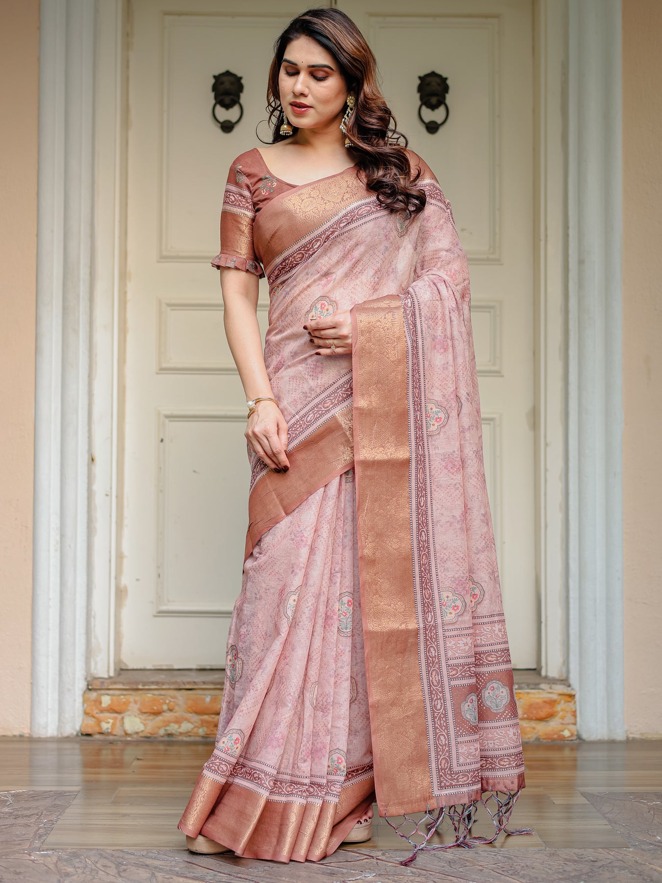 A rich copper zari woven border enhances the elegance, while the pallu showcases coordinated traditional weaving finished with handcrafted tassels that add artisanal charm. The muted tone paired with metallic weaving gives the saree a premium festive appearance without being overpowering.