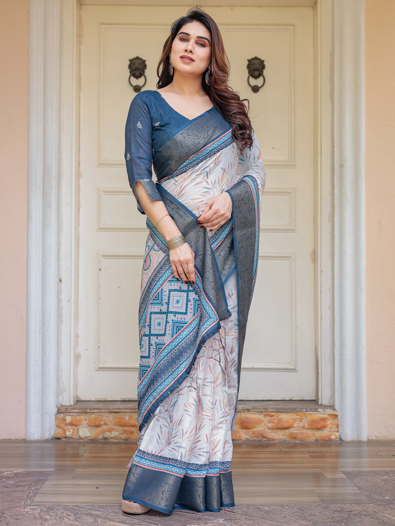 Saree Color: Off-White with Steel Grey & Teal Border