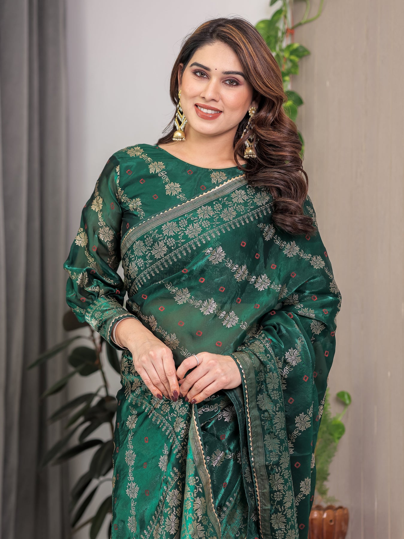 Pair this emerald green saree with antique gold or Kundan jewellery to highlight its regal undertones. Opt for a sleek low bun or soft side-swept curls, and complete the look with golden heels or embellished mojaris. Keep makeup elegant with defined eyes, subtle shimmer, and a deep nude or berry lip shade for a polished ethnic look.