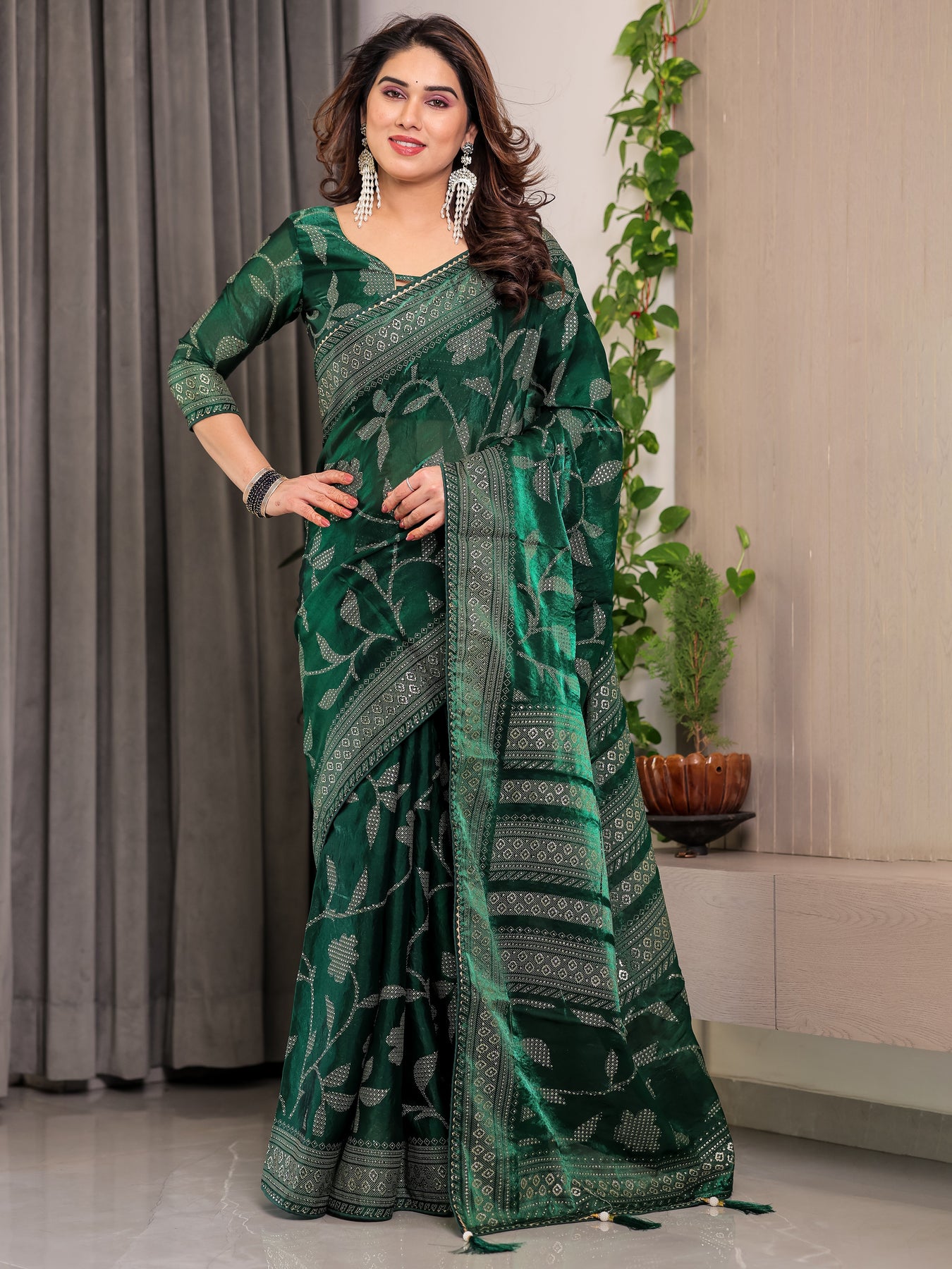 Emerald Green Fendi Satin Leafy Floral Block & Foil Printed Saree with Ornamental Border, Tassel Edges & Attached Blouse
