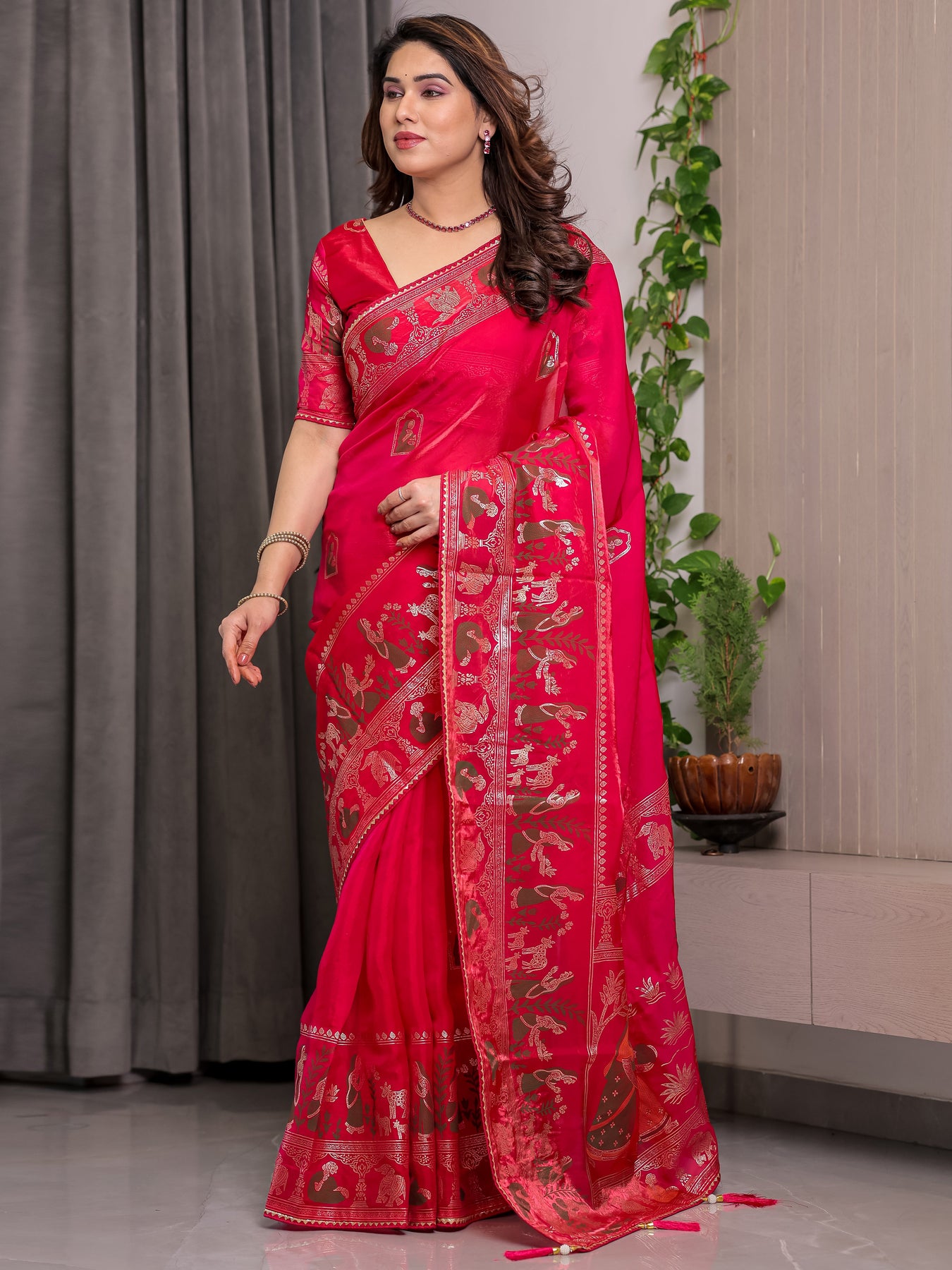 Finished with elegant tassels along the edges, this saree reflects meticulous finishing and graceful movement. It comes with a matching attached blouse piece, thoughtfully coordinated to complement the saree’s vibrant color and intricate design, offering versatile styling for festive and ceremonial occasions.