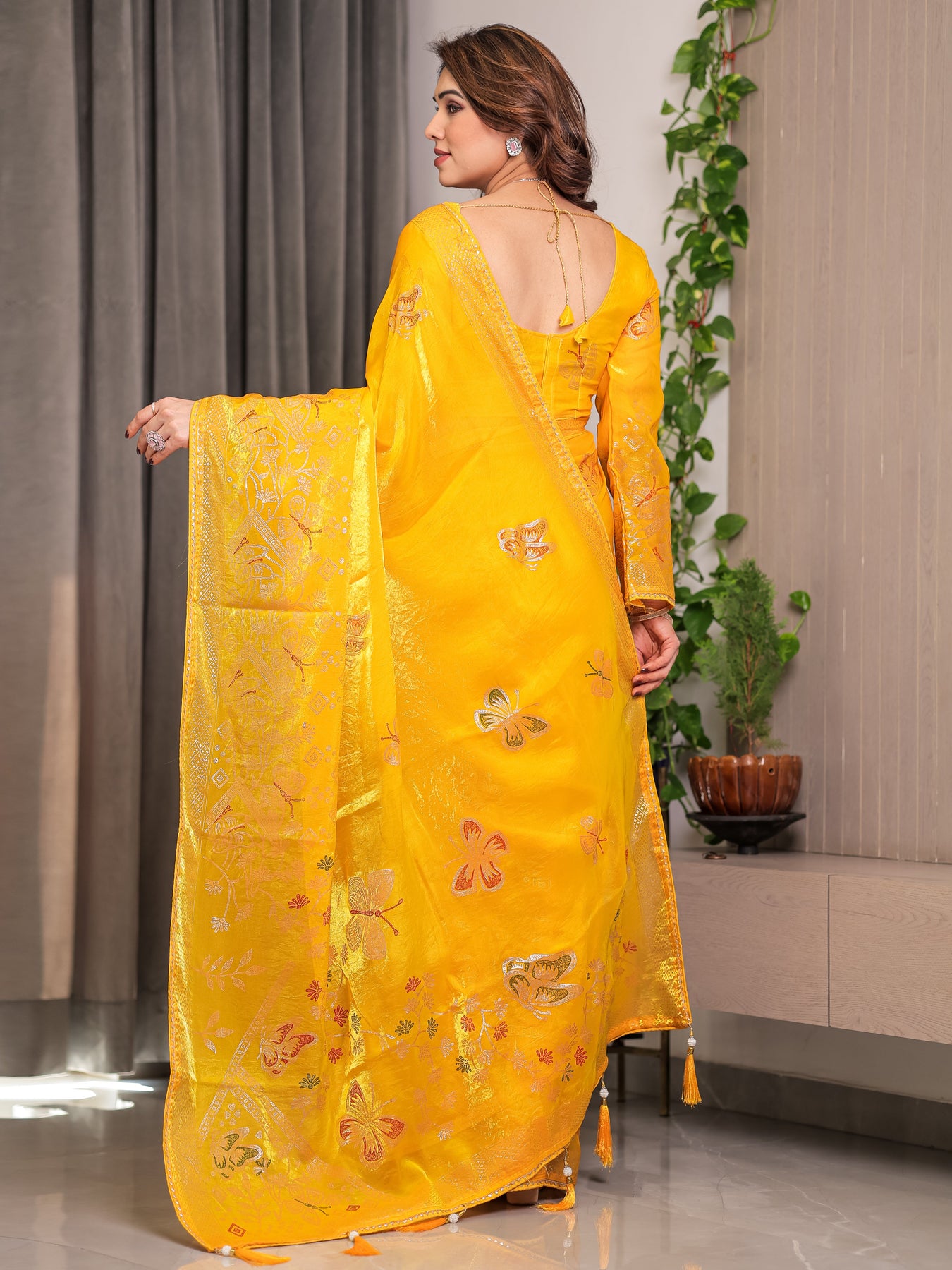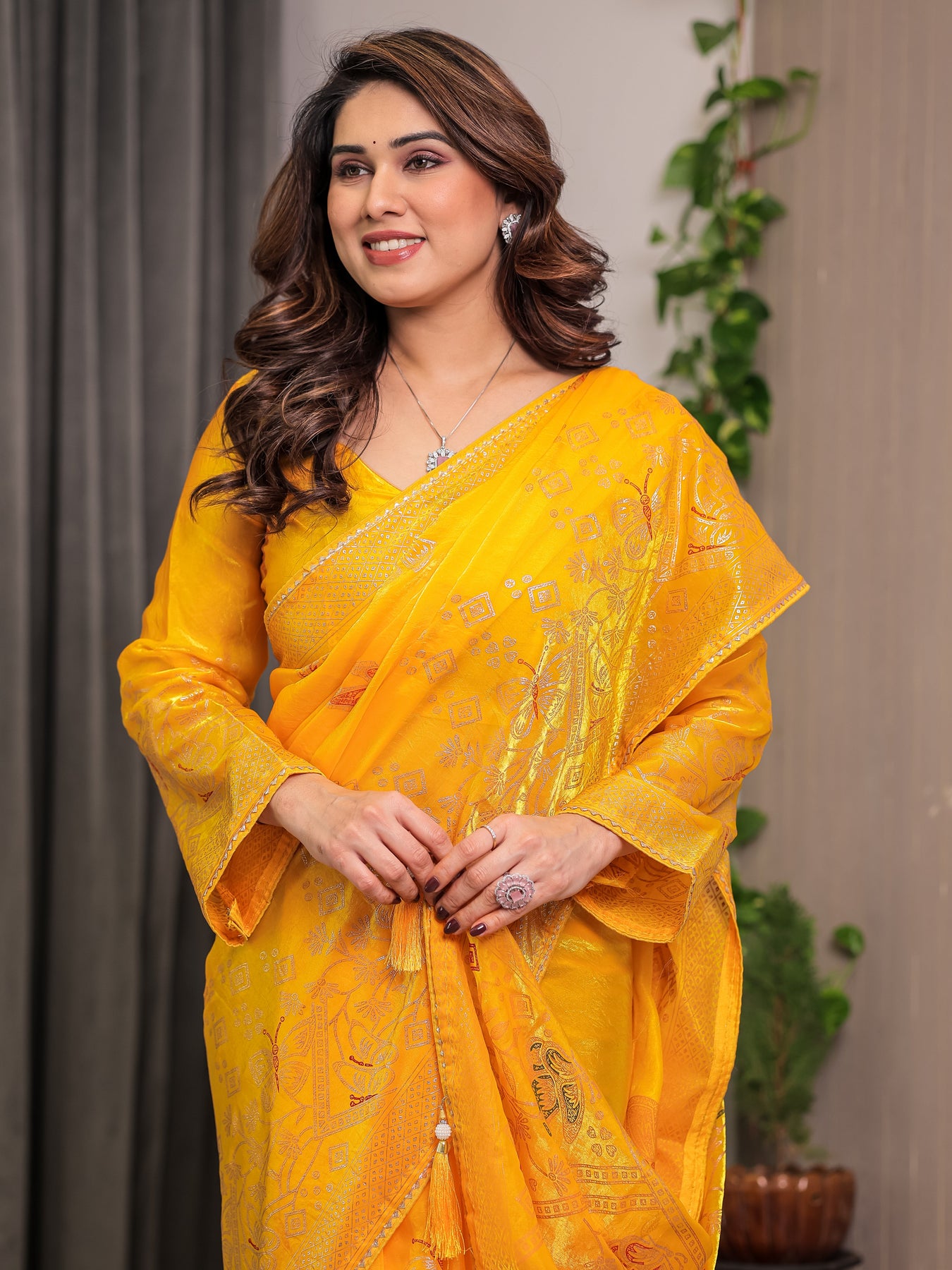 Sunshine Yellow Fendi Satin Block & Foil Print Saree with Attached Blouse & Tassel Detailing