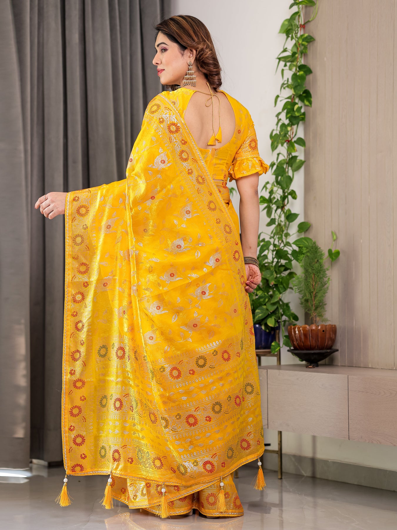 Sunshine Yellow Fendi Satin Floral Block & Foil Printed Saree with Ornamental Border, Tassel Edges & Attached Blouse