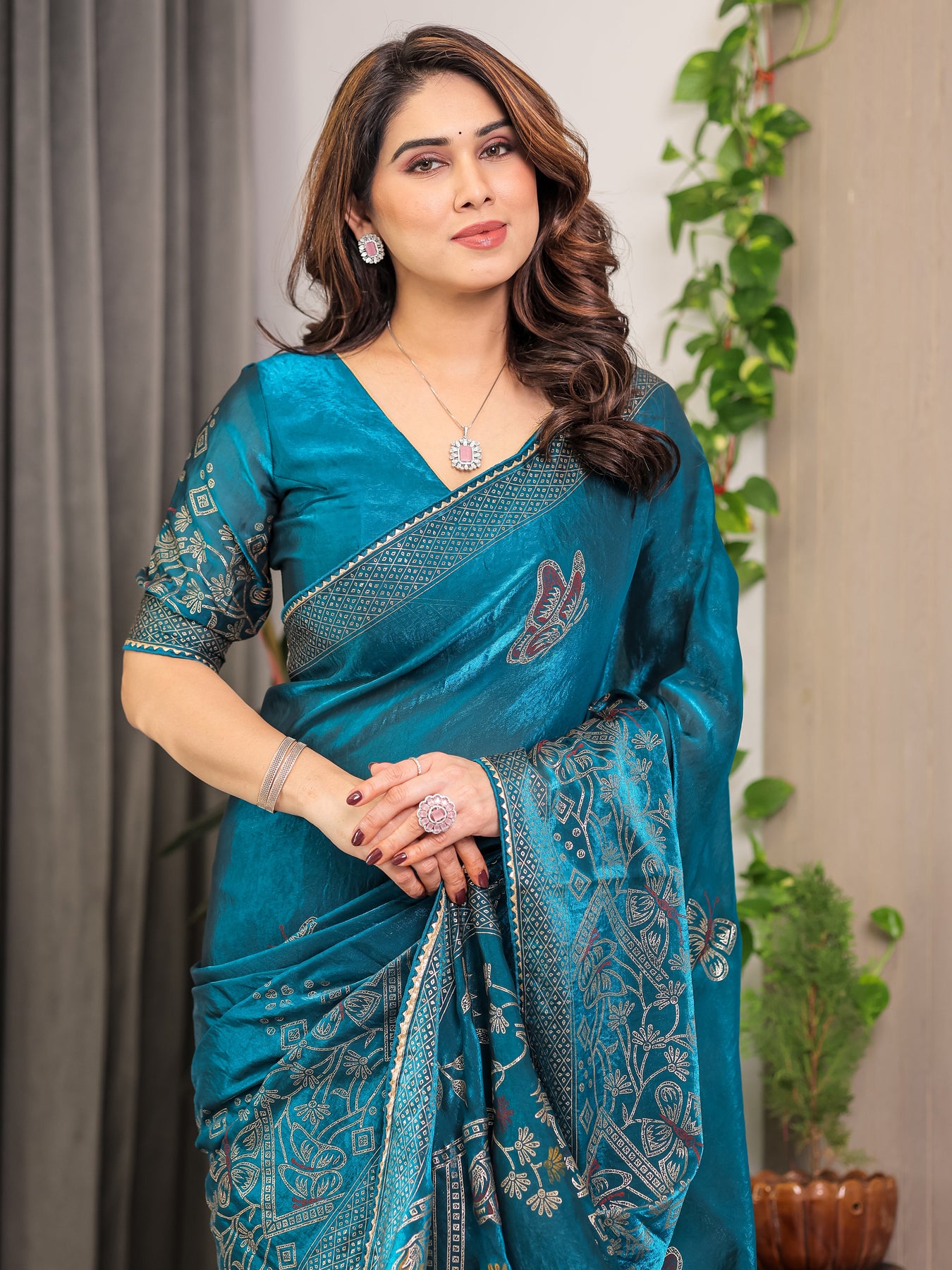Pair this saree with antique gold, Kundan, or oxidised silver jewellery to highlight the intricate prints. Style your hair in soft waves or a sleek low bun to keep the look elegant and balanced. Complete the ensemble with metallic heels or embroidered juttis. Opt for dewy makeup with kohl-lined eyes and a bold or nude lipstick to enhance the richness of the satin finish.