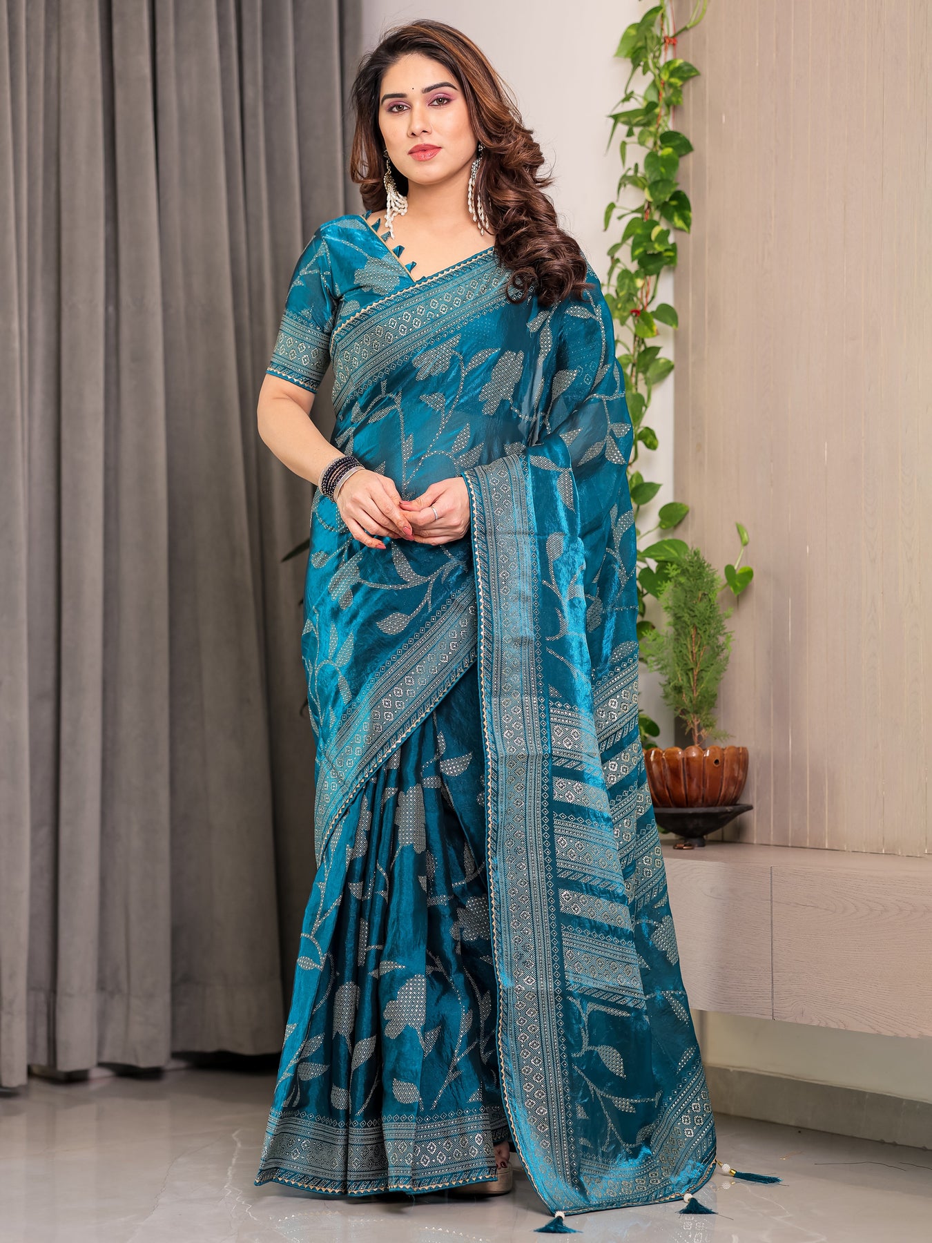 Teal Blue Fendi Satin Leafy Floral Block & Foil Printed Saree with Ornamental Border, Tassel Edges & Attached Blouse