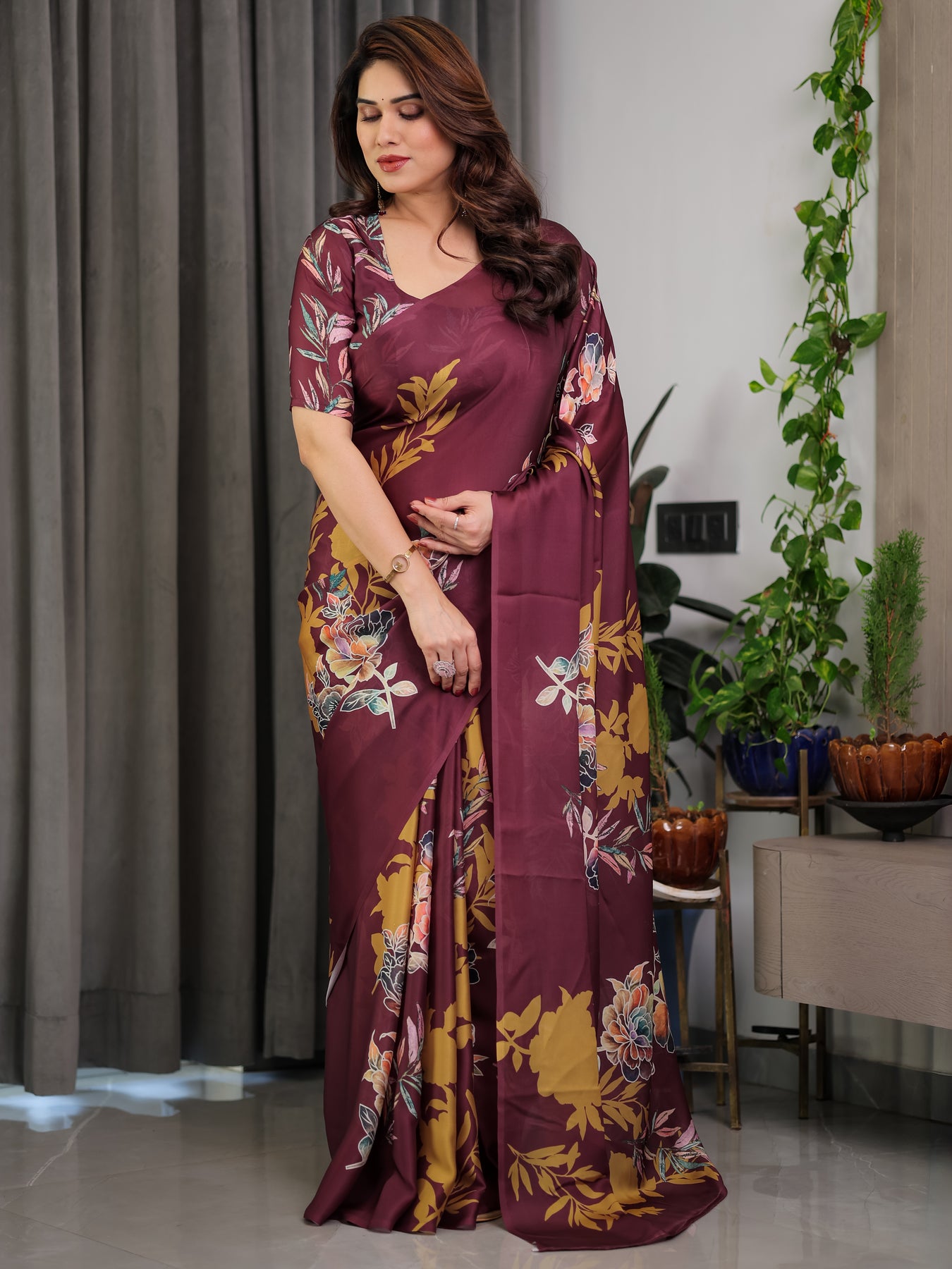 Maroon Floral Satin Georgette Saree with Mustard Leaf Print & Designer Attached Blouse – Soft Elegant Draping Saree