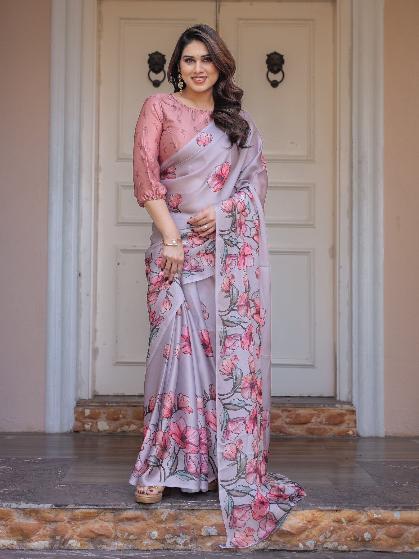 Bring effortless elegance to your wardrobe with this graceful floral satin georgette saree, designed for women who love soft sophistication and timeless charm.