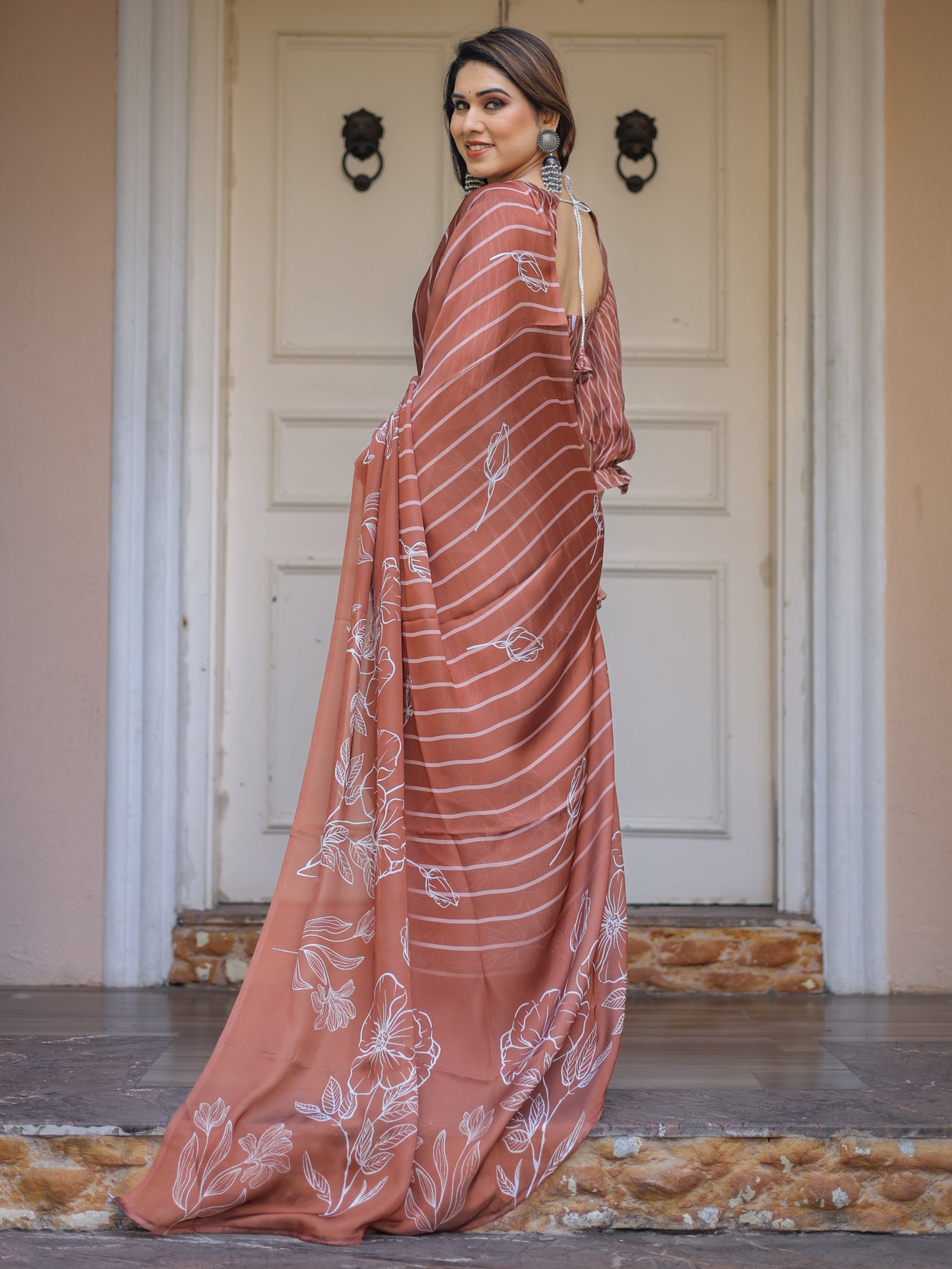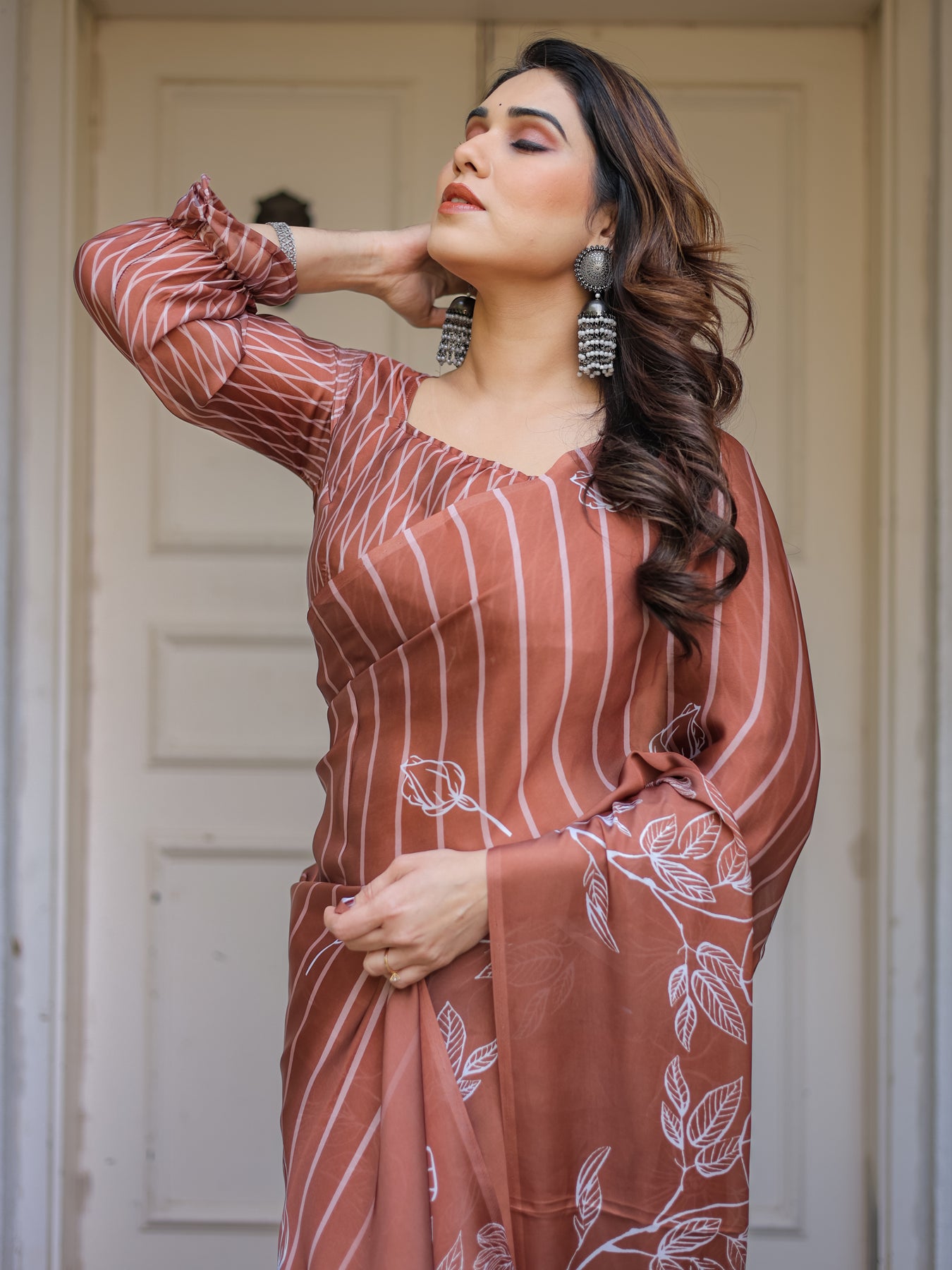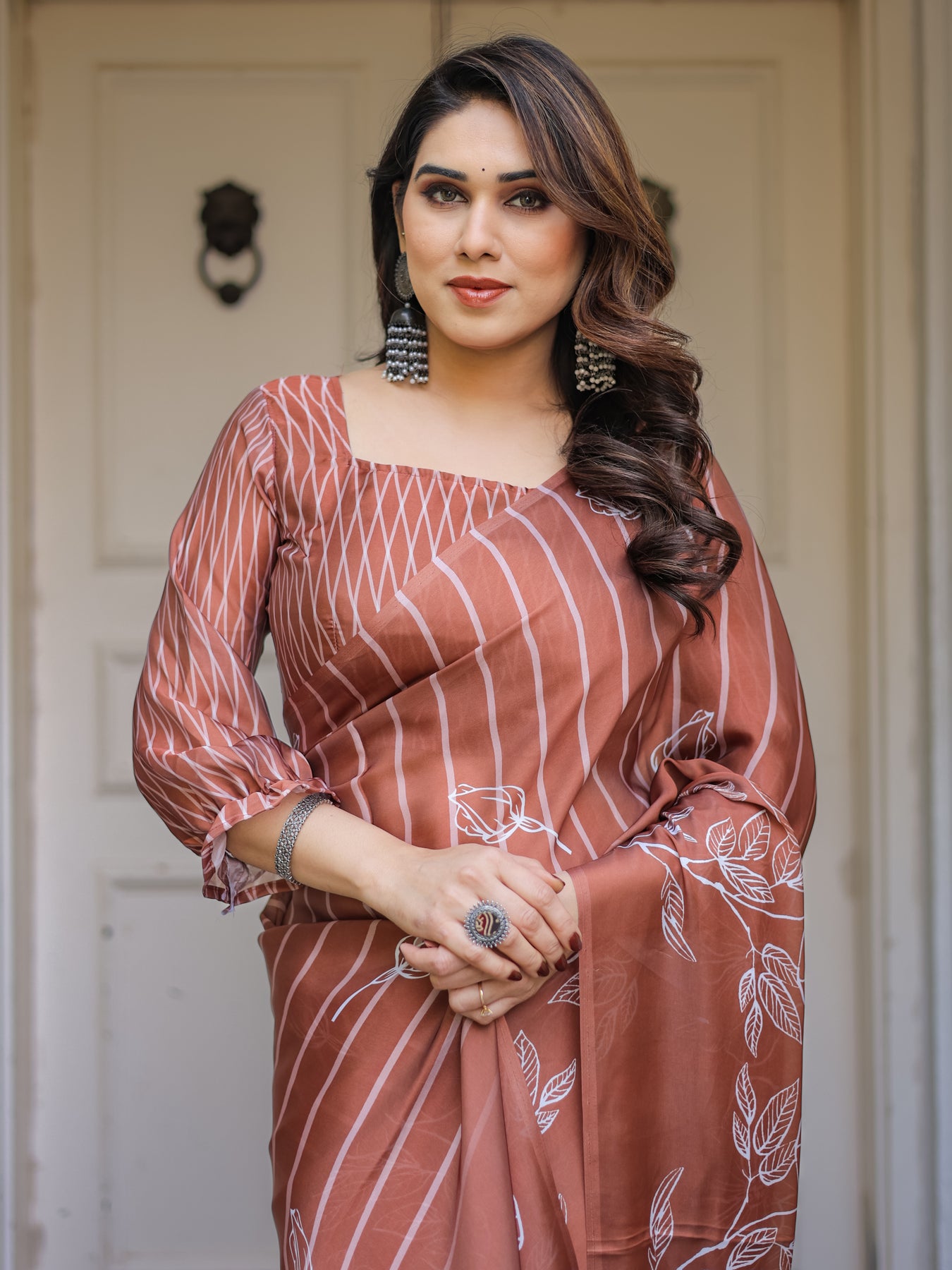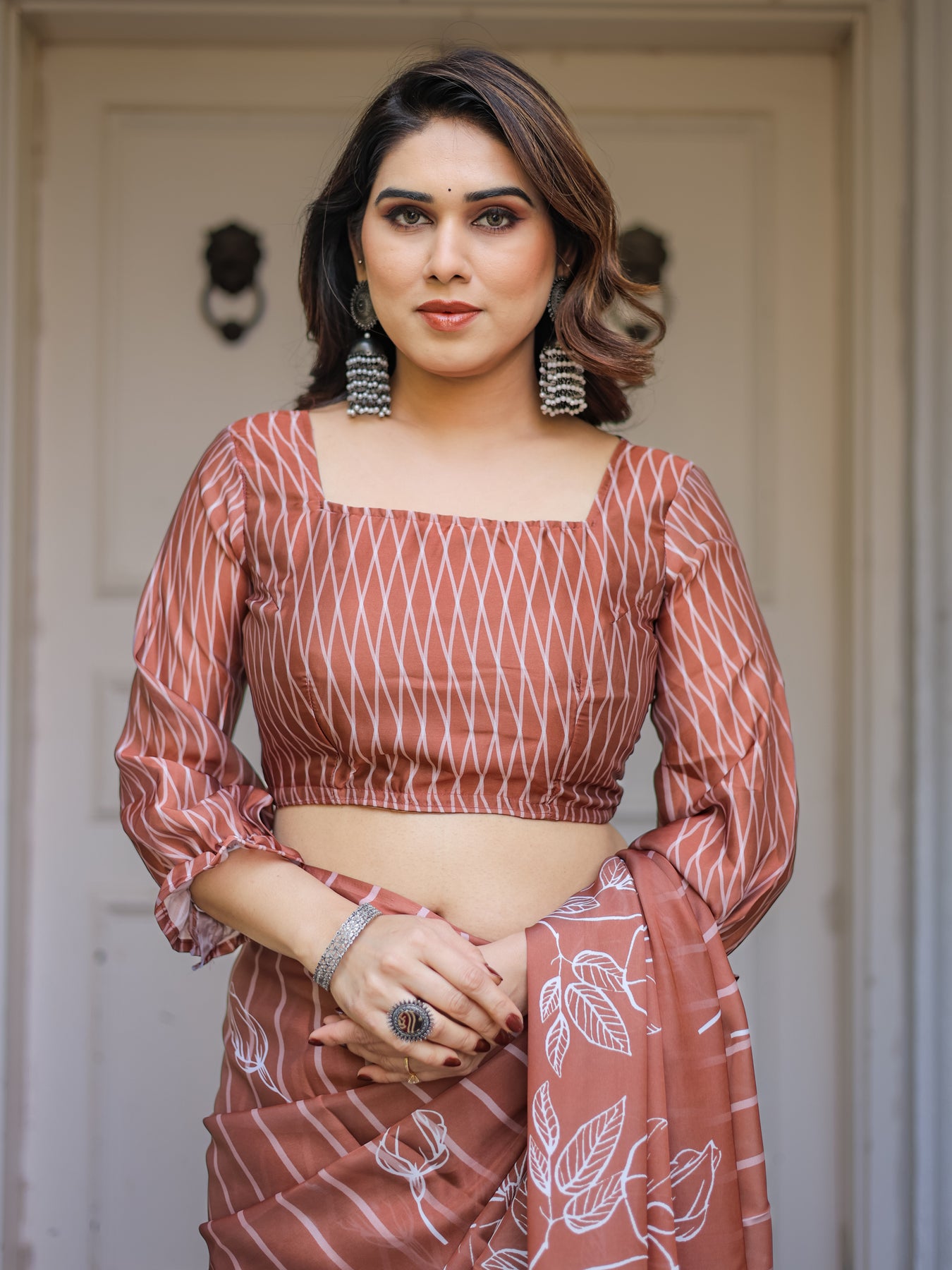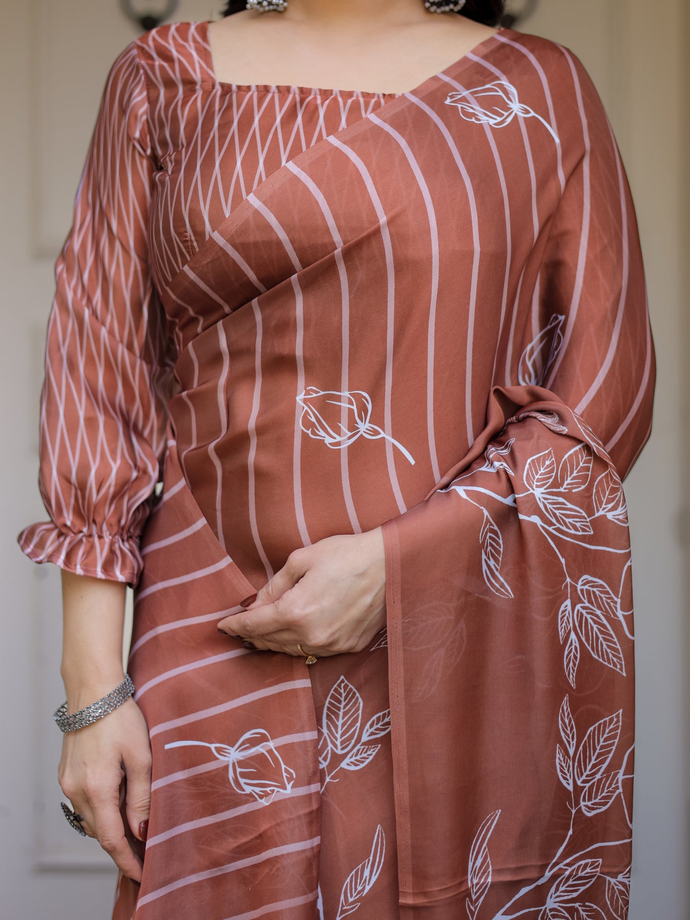 Style it with pearl jewellery, minimal gold accessories, or statement earrings for an effortlessly graceful look.
