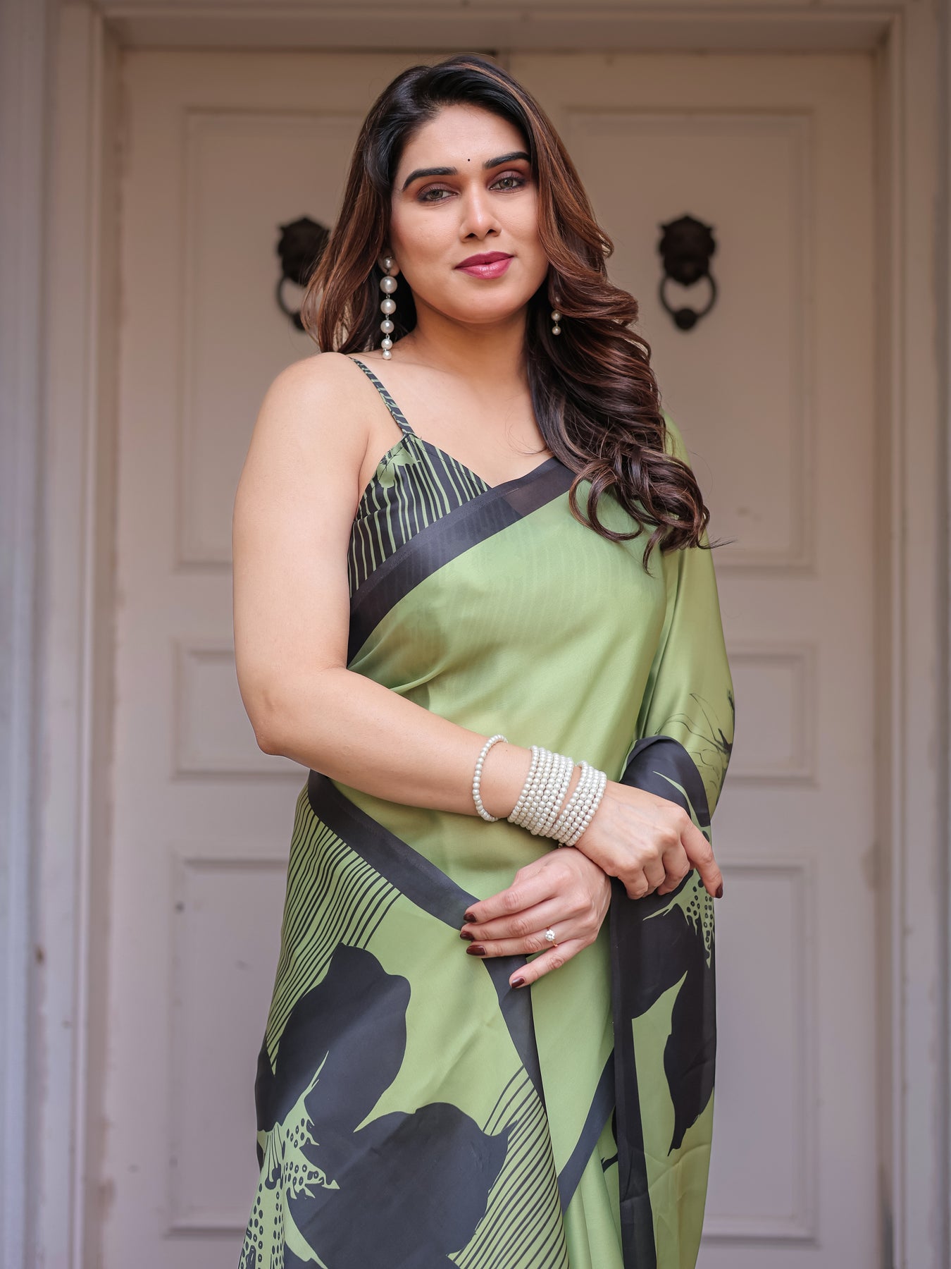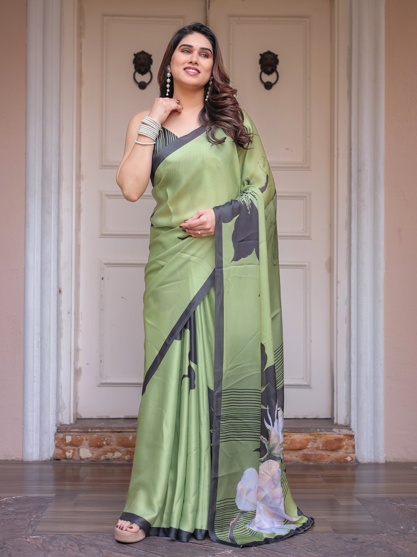 Step into contemporary elegance with this olive green satin georgette printed saree, thoughtfully designed for women who love bold artistry blended with graceful sophistication. The saree features a refreshing pistachio-green base highlighted with dramatic black floral silhouettes and fine linear stripe accents, creating a striking yet balanced visual appeal.