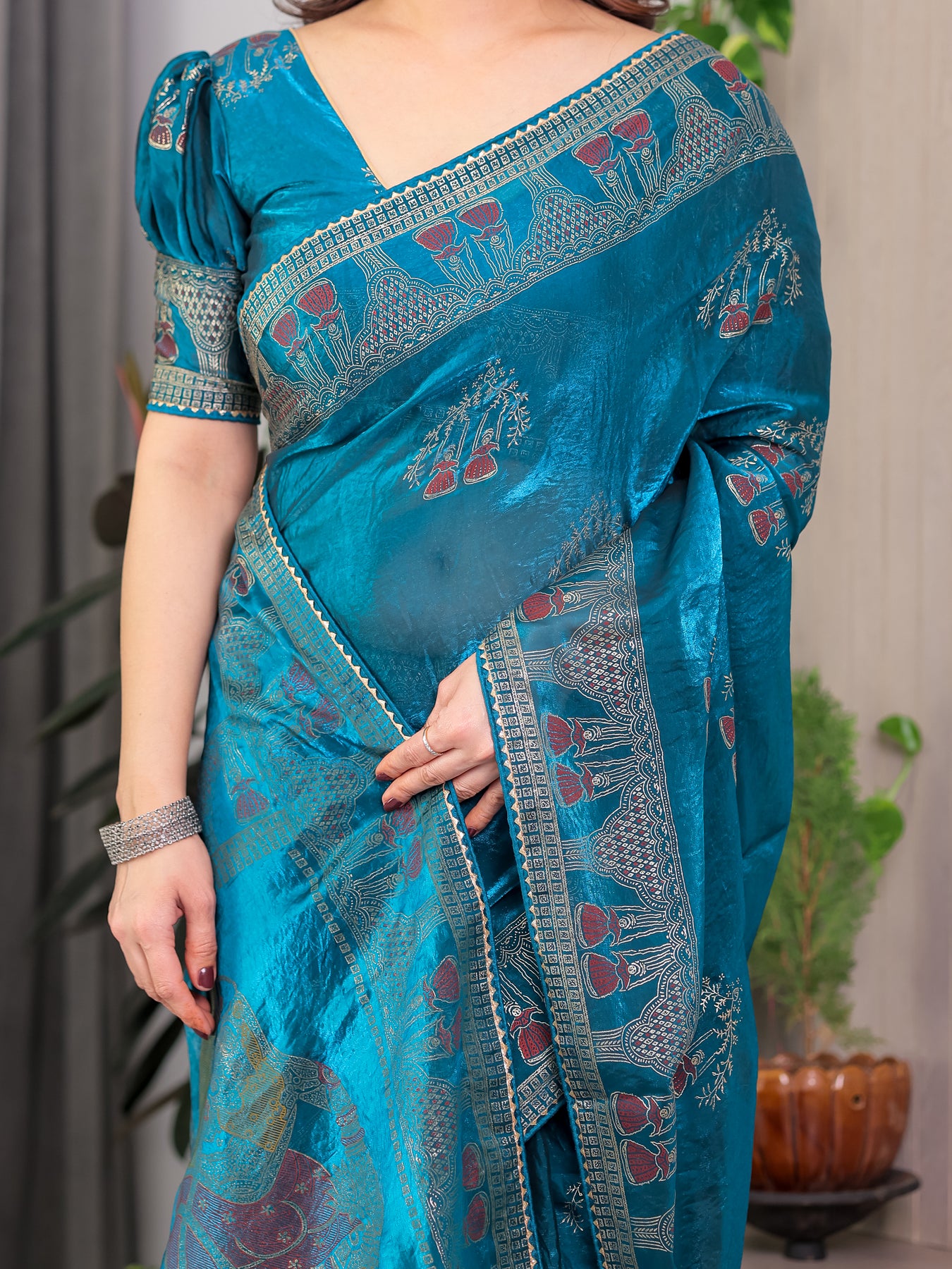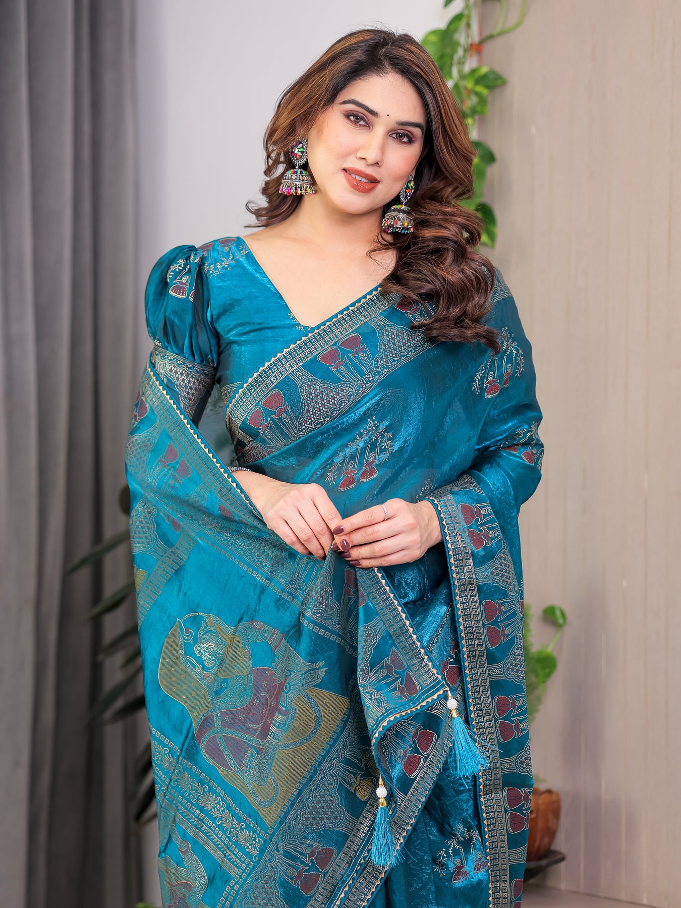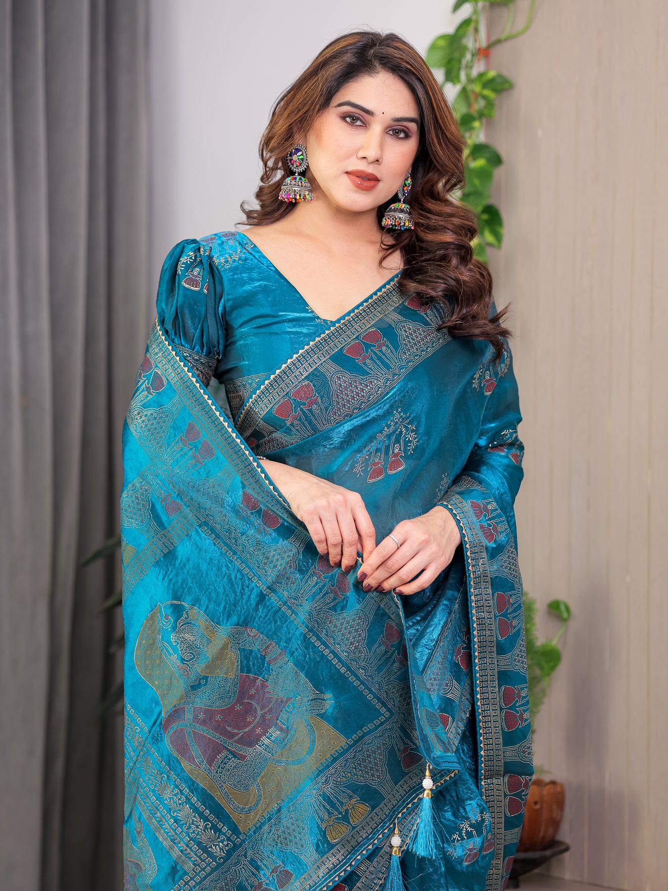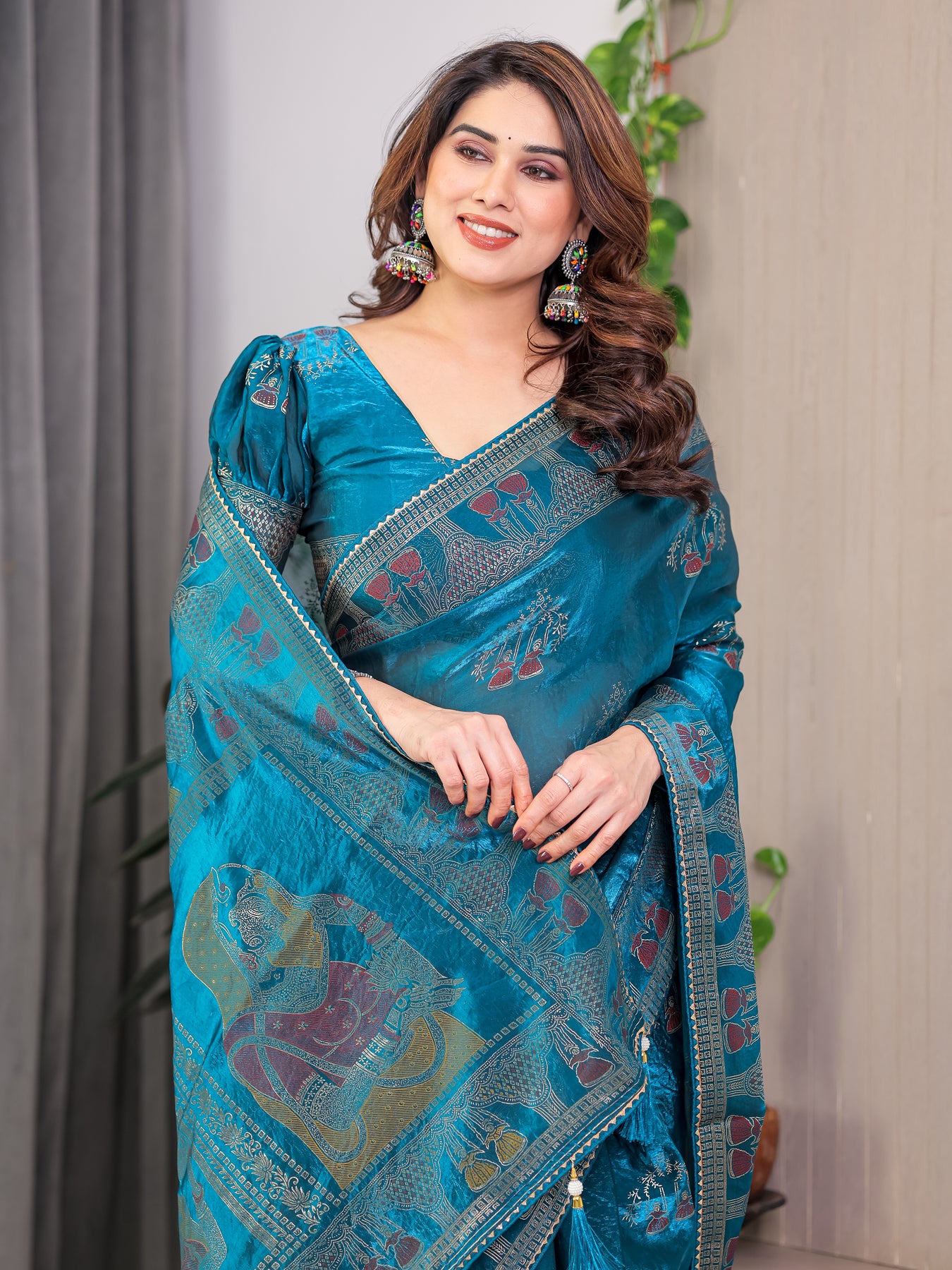 Teal Peacock Blue Fendi Satin Block & Foil Print Saree with Traditional Motif Border & Tassel Detail Blouse